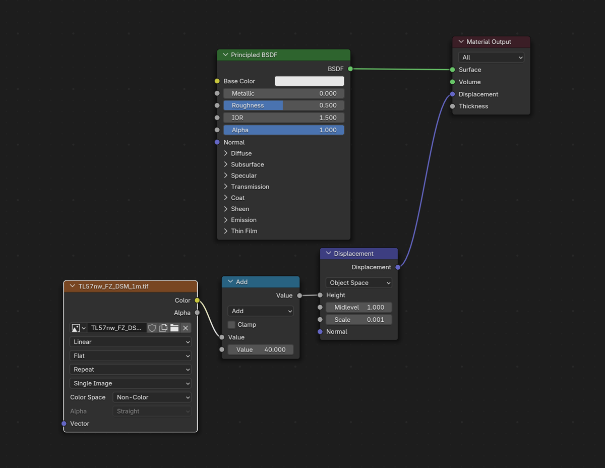 Blender offers a displacement modifier that can be applied to a mesh, which takes a displacement image as input. I started by applying this to a subdivided plane. I swapped to using this displacement image as the displacement input of the plane's material shader. Only because I'm a little more familiar with the shading approach.
